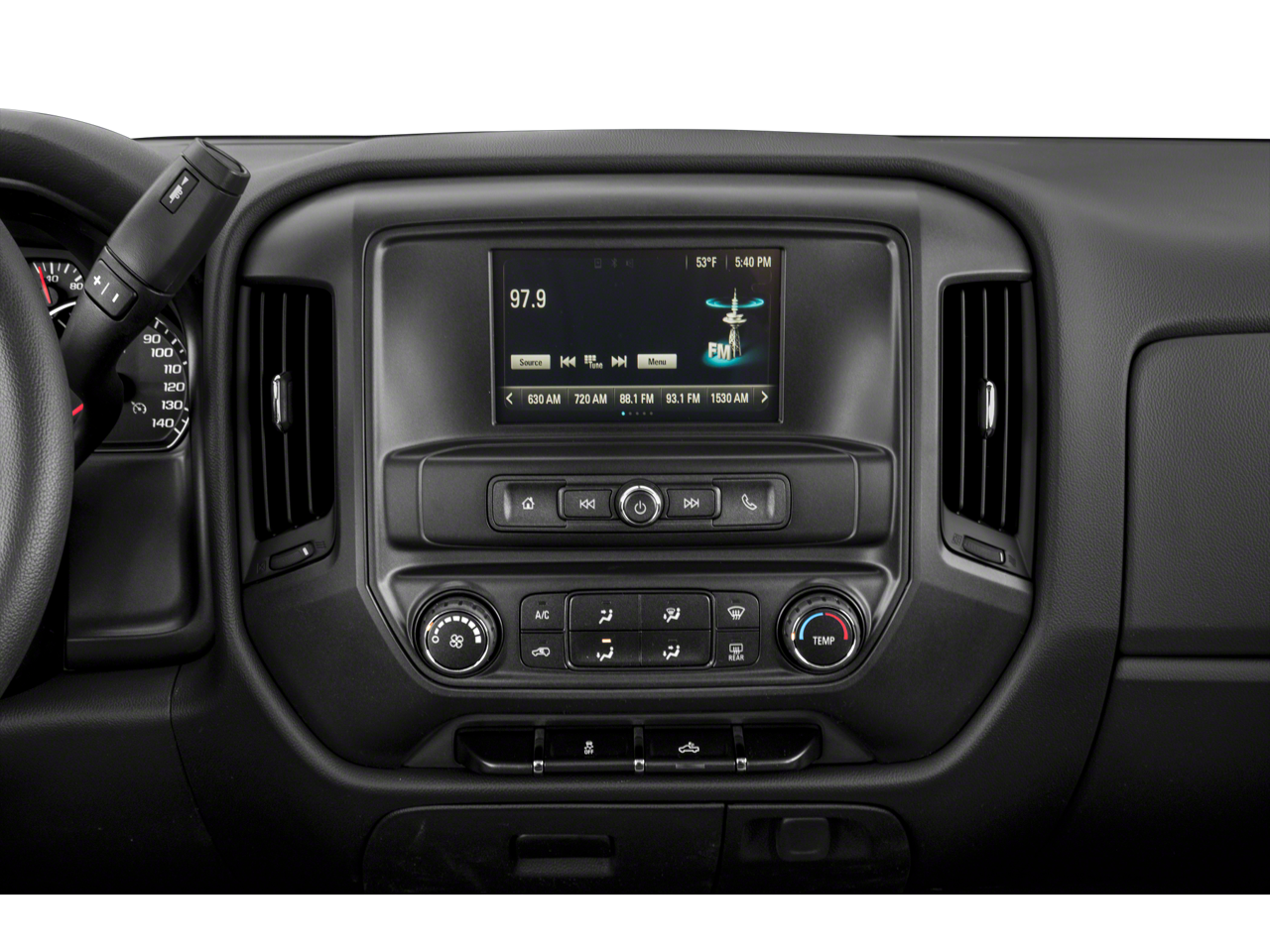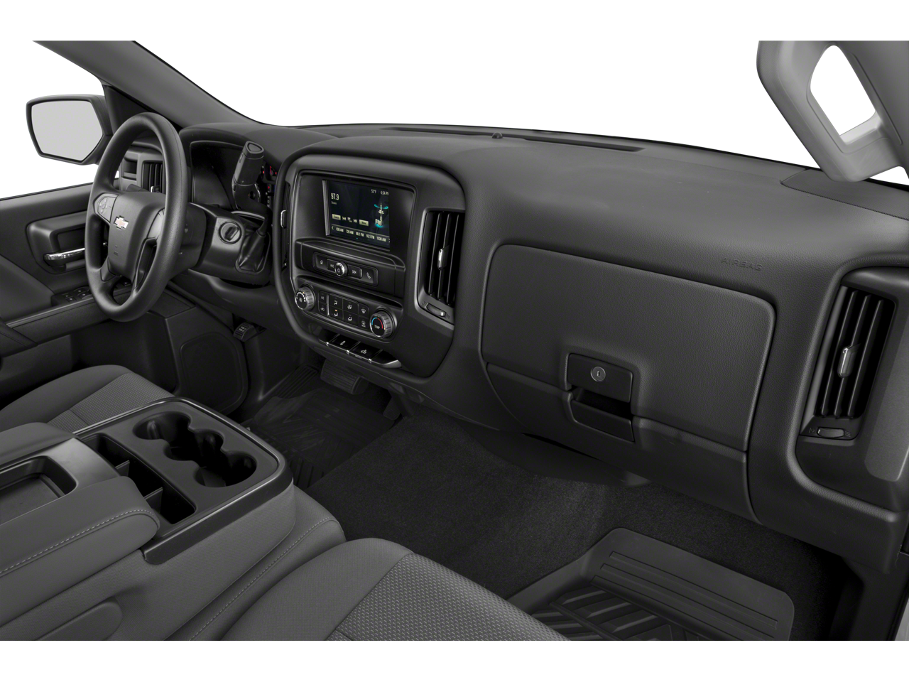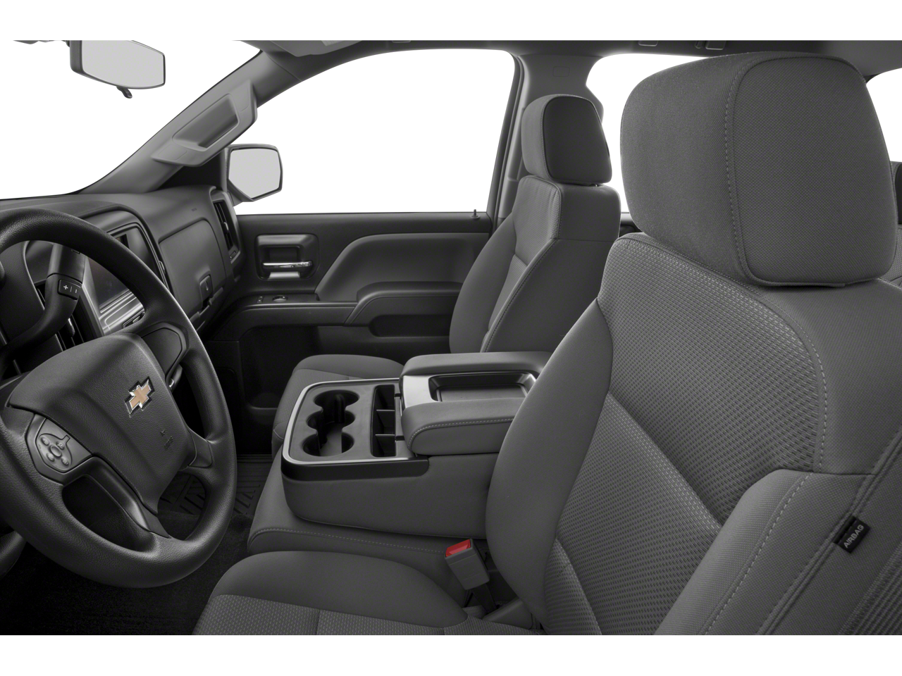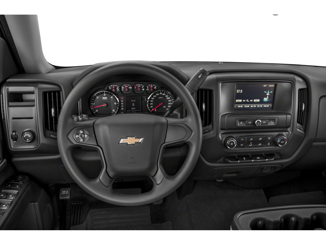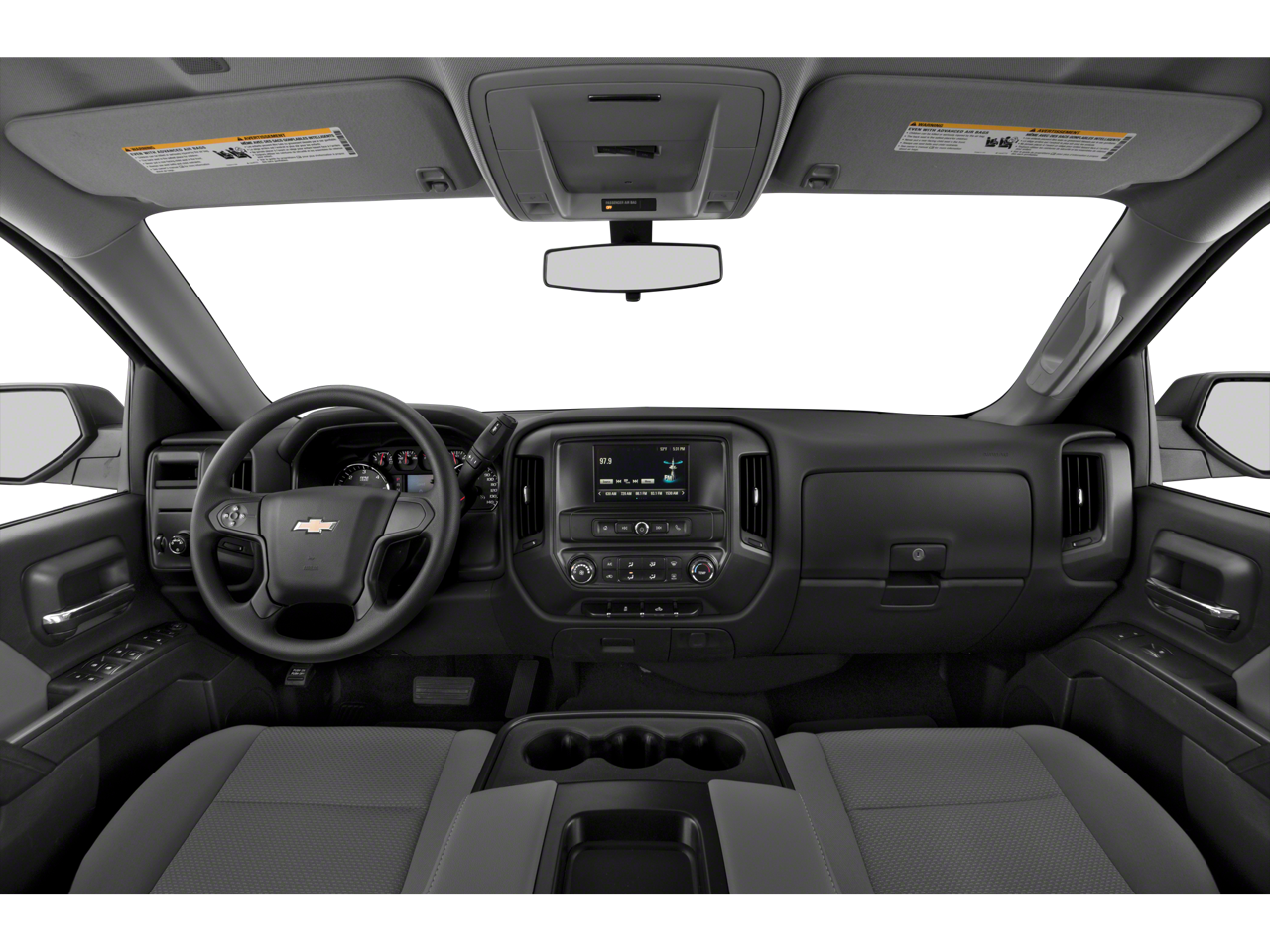20 x 9 Chrome Clad Aluminum Wheels, 3-Passenger Full-Width Folding Rear Bench Seat, 3.42 Rear Axle Ratio, 4-Wheel Disc Brakes, 40/20/40 Front Split Bench Seat, 6 Speakers, ABS brakes, Air Conditioning, Alloy wheels, AM/FM radio, Black Power-Adjustable Heated Outside Mirrors, Body Color Front Bumper, Body Color Rear Bumper w/Cornersteps, Body-Color Grille Surround, Body-Color Headlamp Bezels, Brake assist, Bumpers: body-color, Chrome wheels, Cloth Seat Trim, Deep-Tinted Glass, Delay-off headlights, Driver door bin, Driver Information Center, Dual front impact airbags, Dual front side impact airbags, Electronic Stability Control, Exterior Parking Camera Rear, Front anti-roll bar, Front Center Armrest w/Storage, Front Frame-Mounted Black Recovery Hooks, Front reading lights, Front wheel independent suspension, Fully automatic headlights, Graphite-Colored Rubberized-Vinyl Floor Covering, Heated door mirrors, Heavy Duty Suspension, High-Intensity Discharge Headlights, Low tire pressure warning, Manual Tilt-Wheel Steering Column, Occupant sensing airbag, Overhead airbag, Overhead console, Passenger door bin, Passenger vanity mirror, Power door mirrors, Power steering, Power windows, Premium audio system: Chevrolet MyLink, Radio data system, Radio: AM/FM 7 Diagonal Color Touch Screen, Rear reading lights, Rear step bumper, Silverado Custom Trim, Speed control, Speed-sensing steering, Split folding rear seat, Tachometer, Tilt steering wheel, Traction control, Trip computer, Variably intermittent wipers, Voltmeter.